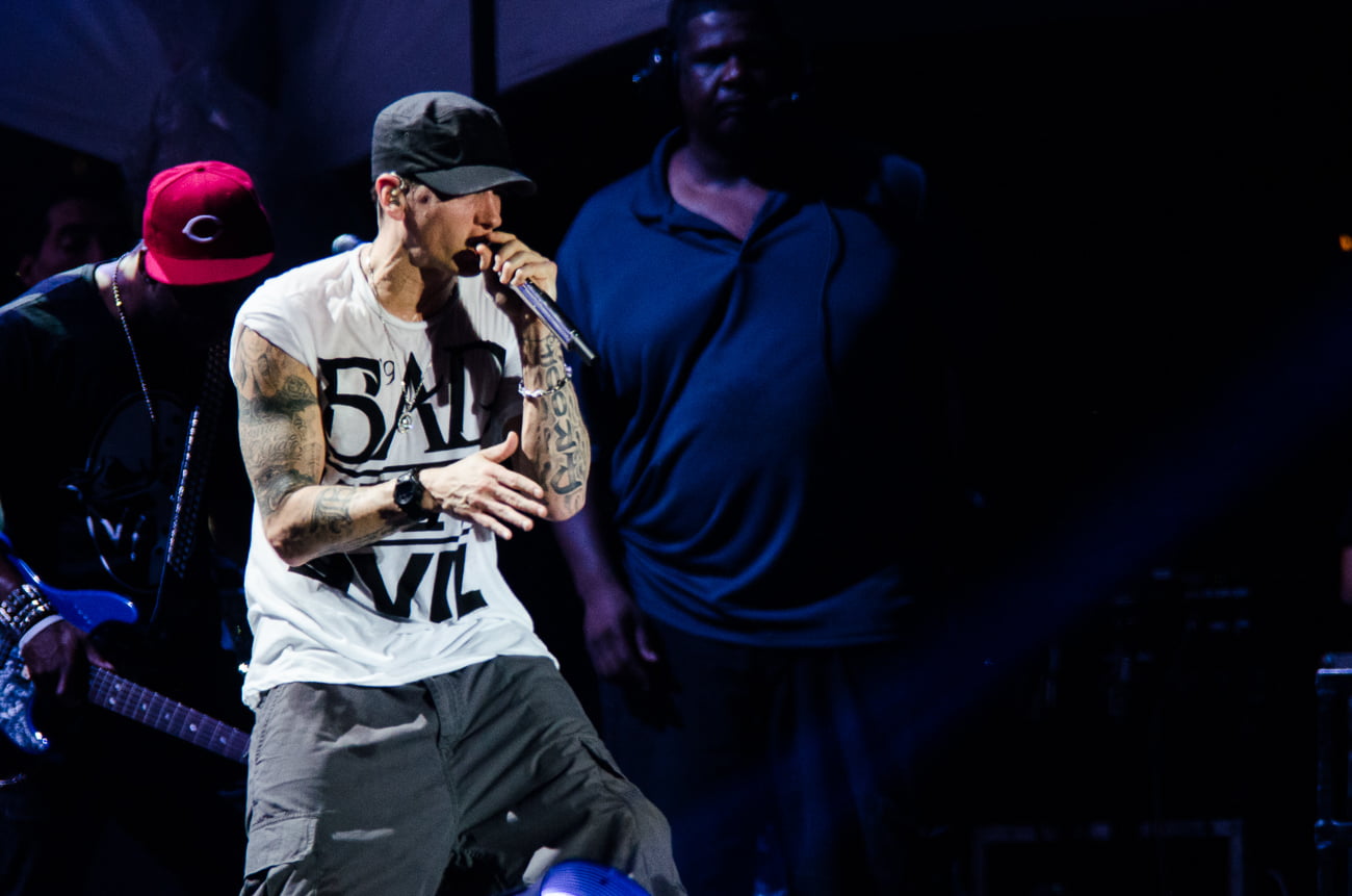 La scène s’illumine, sous les cris du public, un Eminem abîmé mais tout autant puissant s’impose, hoodie gris, casquette noire il se cache presque. Mais enchaîne ses premières chansons, se met à l’aise, jette son attirail et donne le ton avec son tshirt “Bad meets Evil”. La mise en scène est soignée, ombres de femmes qui se dévêtissent, images du quartier qui l’a vu grandir, 8 mile, défilement de tatouages, gouttes de sang qui perlent sur une vitre, kalashnikovs qui se promènent sur l’écran, explosion à faire sursauter un mort.
