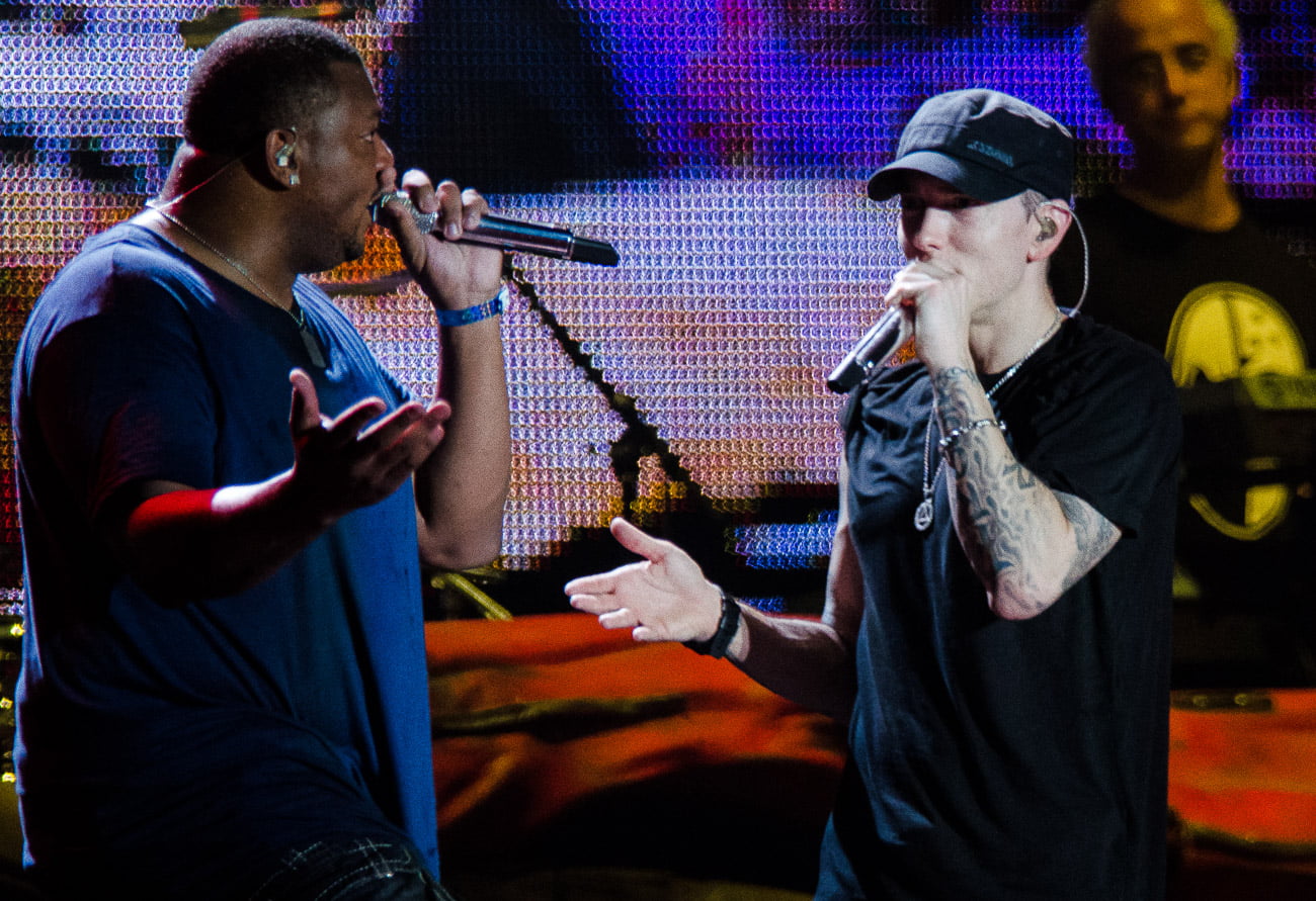 Chaque détail est pensé, il mélange anciens tubes et nouveautés, que le public accueille avec un enthousiasme non dissimulé. Eminem pourrait presque couper son micro, le public connaît chaque chanson par coeur, et donne toute son énergie accumulée.