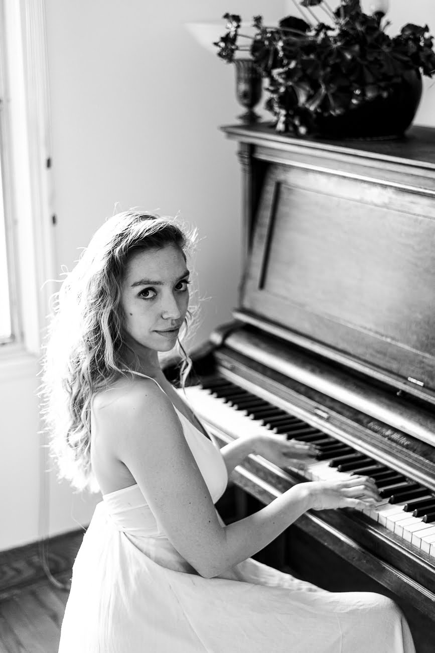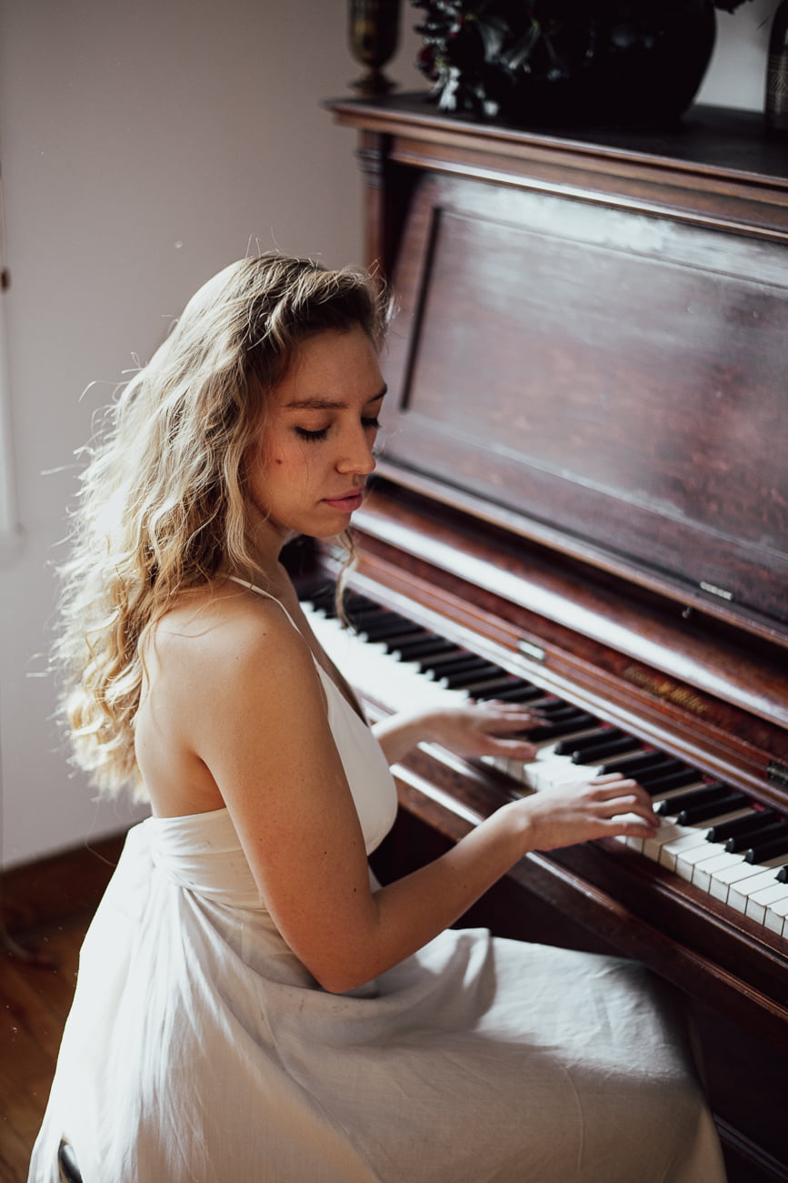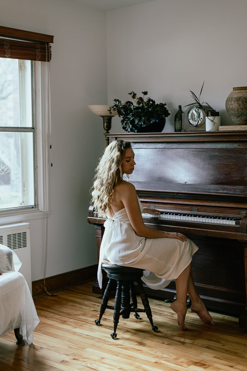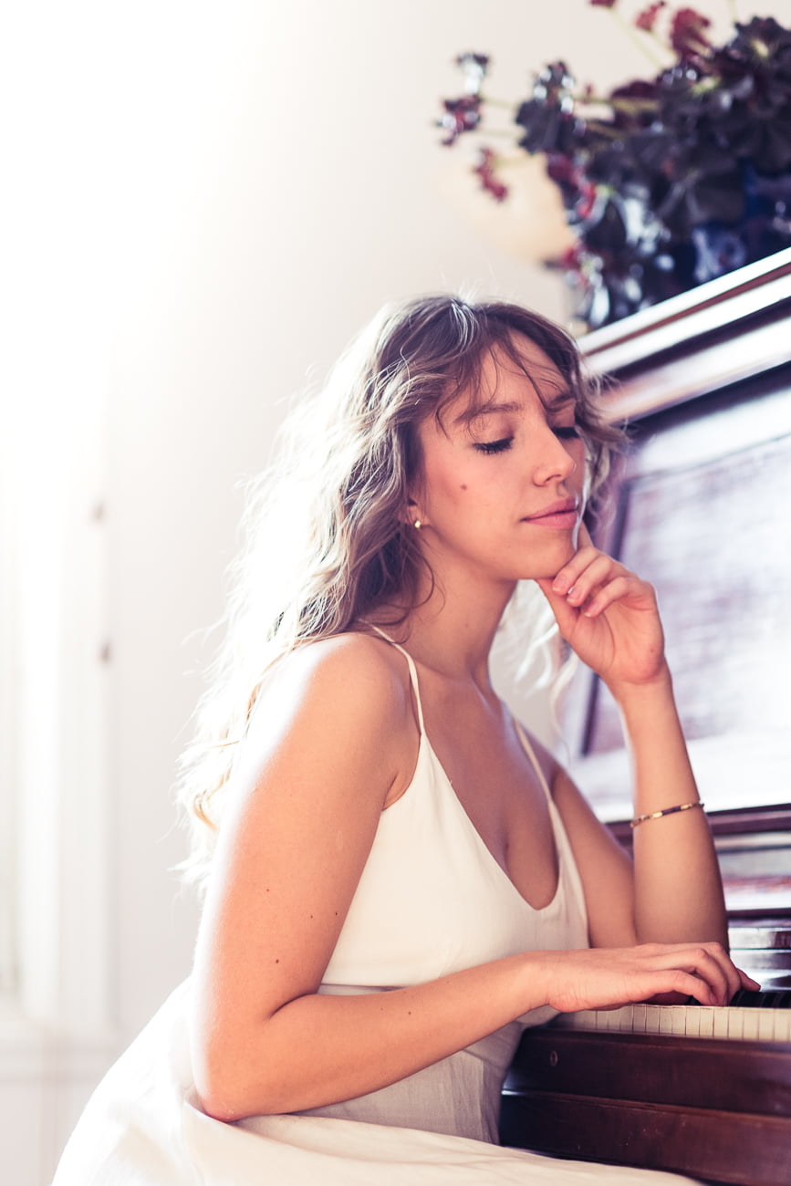 Eva Rosa avait besoin de quelques images pour promouvoir un de ses concerts du temps des fêtes à Montréal. Nous avons donc décidé de faire une série de portraits avec un piano droit, éclairé par la lumière d’une fenêtre. J’avais pris avec moi un flash et un grand diffuseur, mais finalement je ne m’en suis servi que pour une seule image et j’ai continué de prendre les photos avec la lumière naturelle.